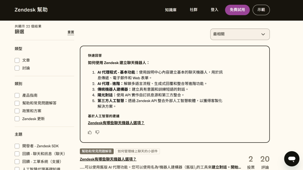 顧客透過關鍵字搜尋後,Zendesk 知識庫支援搜尋 AI 摘要,幫助顧客更有效率獲得需要的答案和內容。